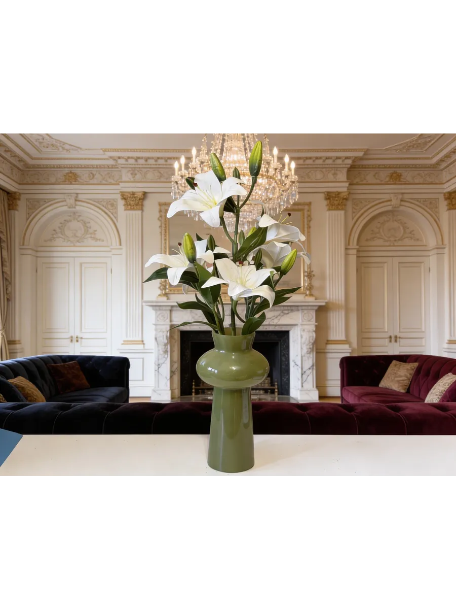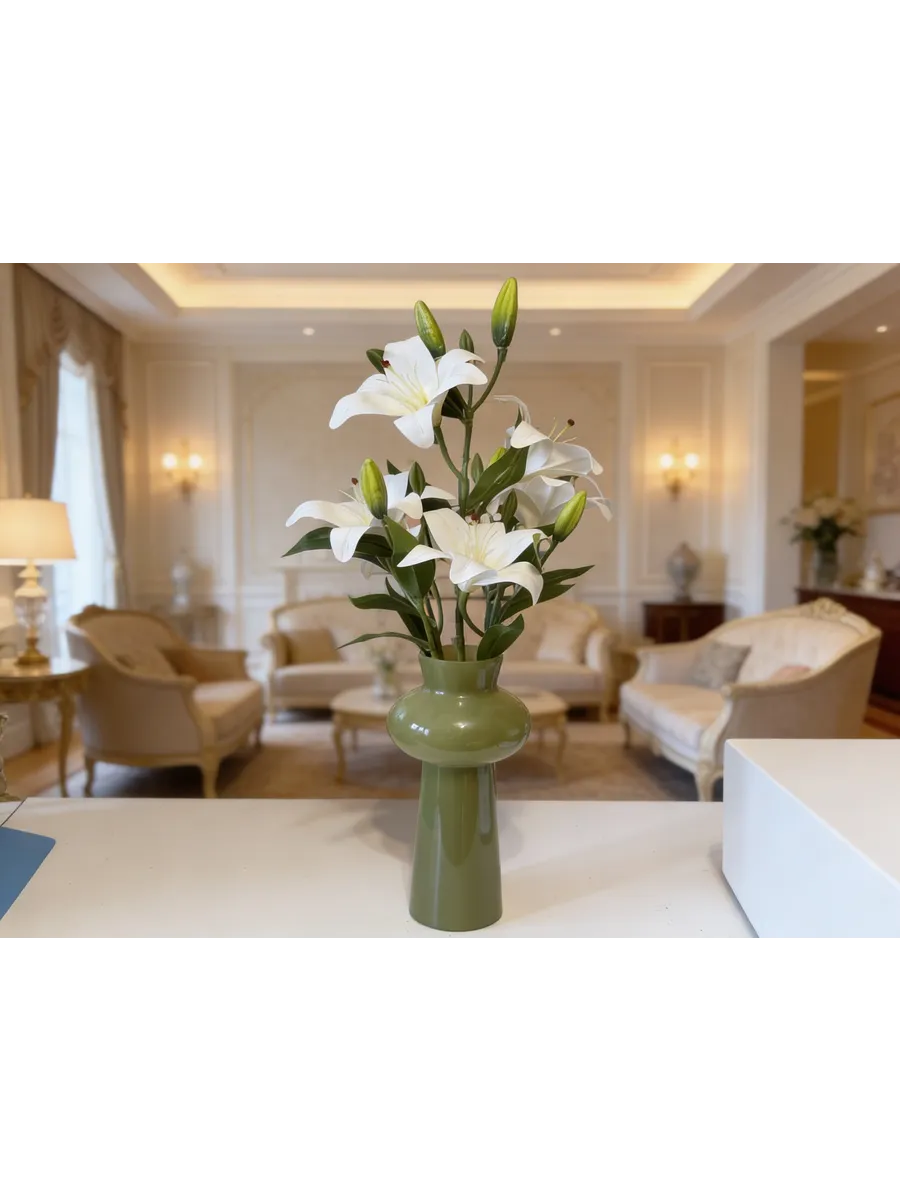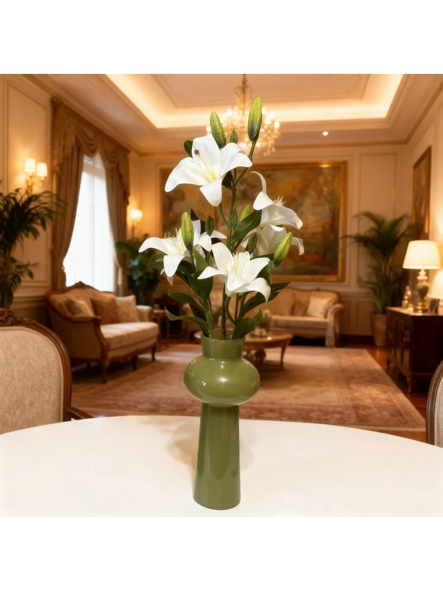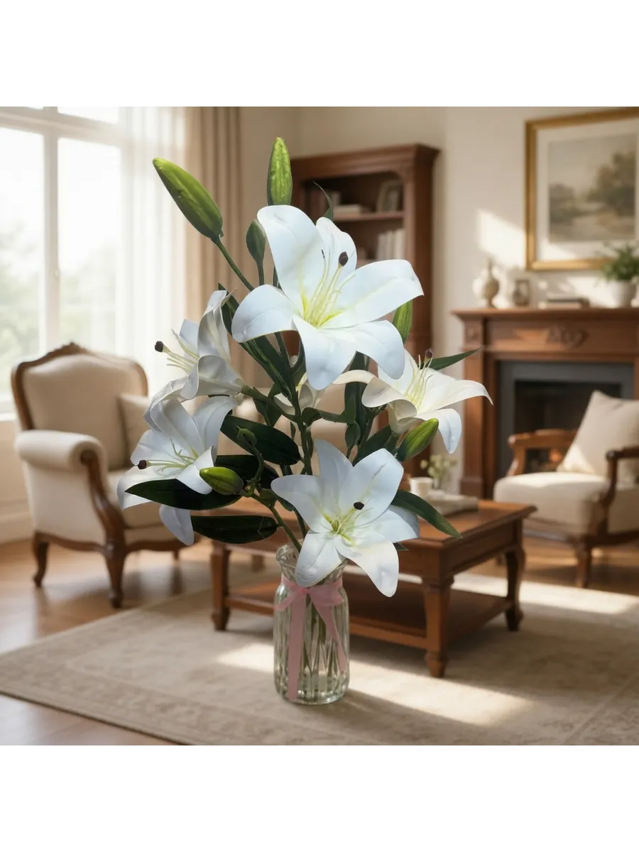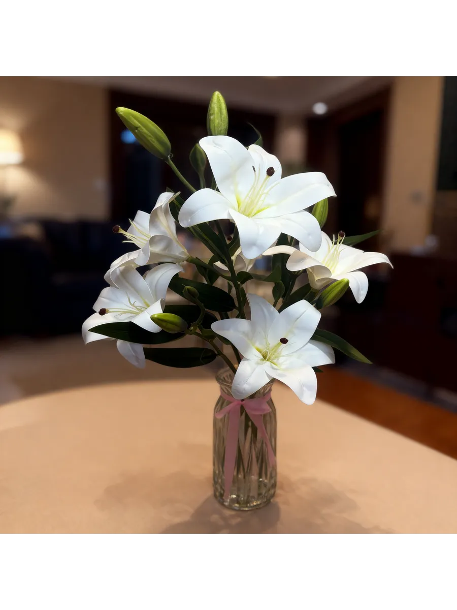 Этот изысканный букет искусственных лилий станет прекрасным украшением любого интерьера. Пять крупных белых цветов лилии с одиннадцатью бутонами создают пышную и реалистичную композицию, которая добавит свежести и уюта в ваш дом. Букет выполнен из высококачественного пластика и силикона, что обеспечивает его долговечность и реалистичный внешний вид. Он станет прекрасным подарком для любимых женщин - мам, бабушек, подруг - по любому поводу, будь то 8 марта, Пасха или просто так.