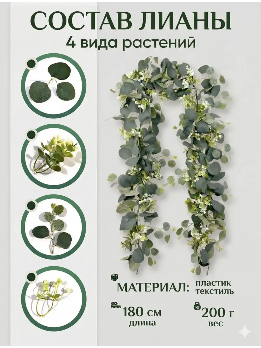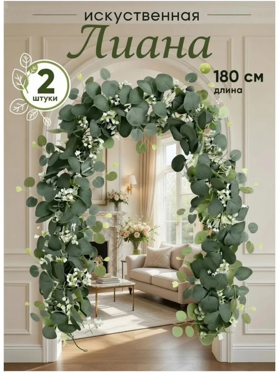 Создайте уютную и свежую атмосферу в своем доме с помощью этих очаровательных искусственных лиан эвкалипта. Этот набор из двух реалистичных лиан с изысканными зелеными листьями и нежными цветами станет прекрасным дополнением к любому интерьеру. Искусственные лианы не требуют ухода, сохраняя свою красоту круглый год. Используйте их для украшения стен, полок, арок или создайте из них оригинальную гирлянду.