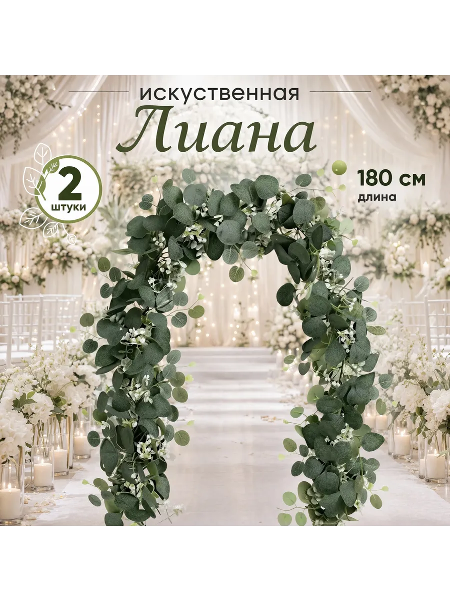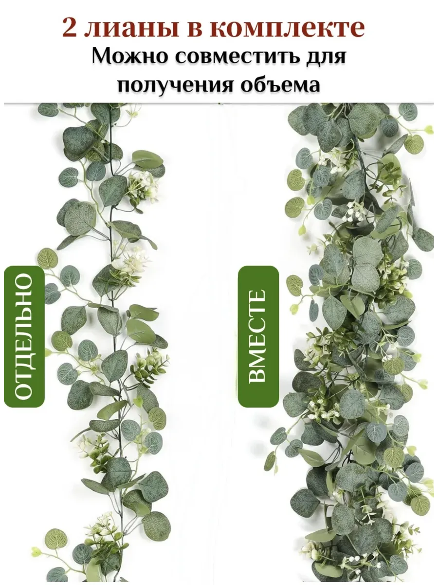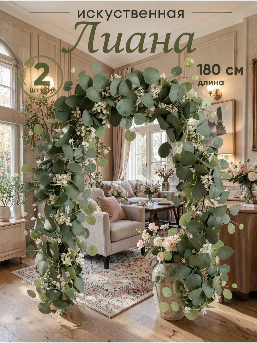 Создайте уютную атмосферу в своем доме с помощью этой очаровательной лианы эвкалипта с декоративными цветами. Этот реалистичный искусственный экземпляр, выполненный из качественного пластика и текстиля, станет прекрасным дополнением к любому интерьеру. Комплект из двух лиан позволит вам создать пышную и зеленую композицию, которая оживит любое пространство. Идеально подходит для украшения дома, офиса или в качестве подарка для любимых.
