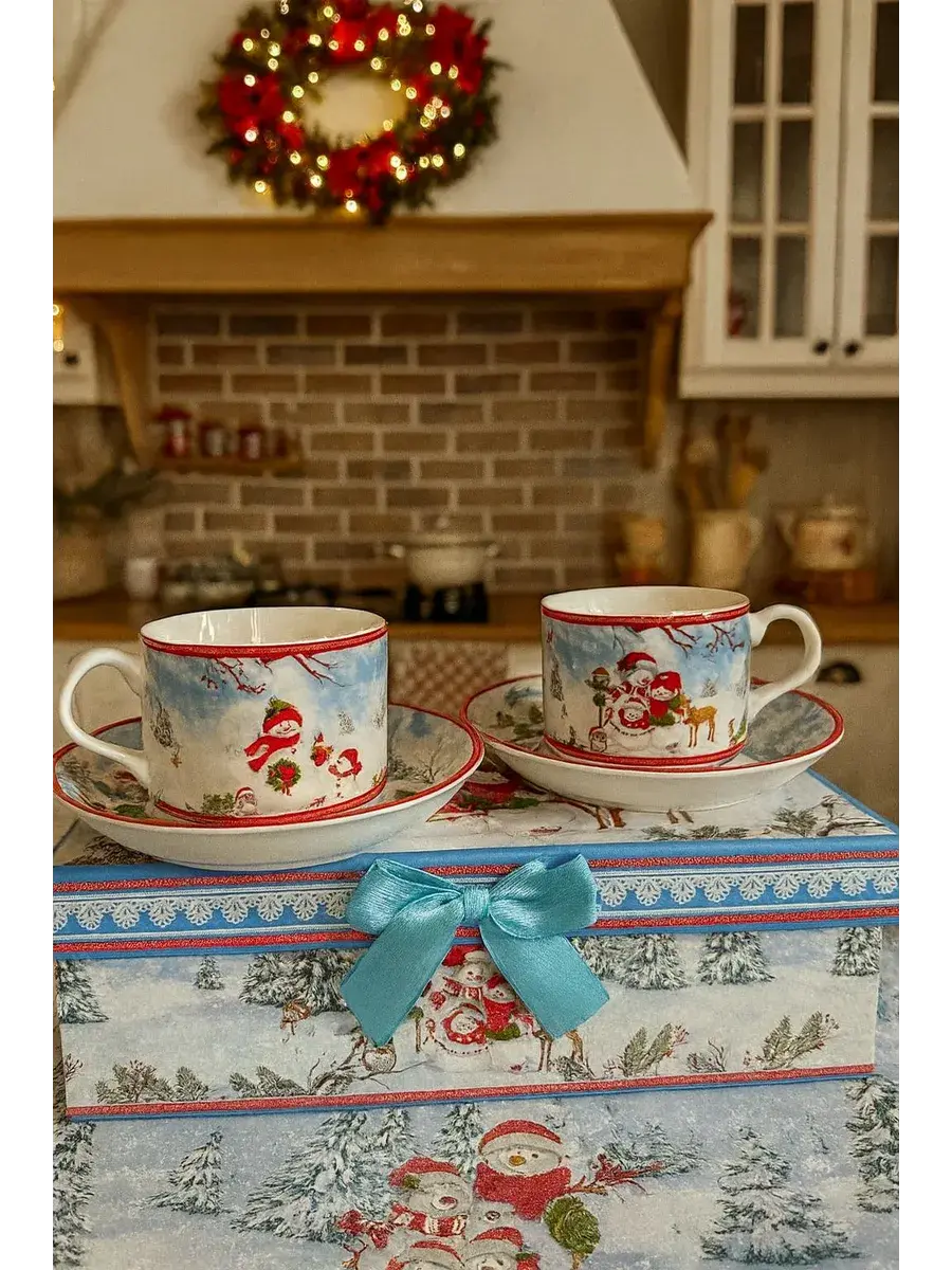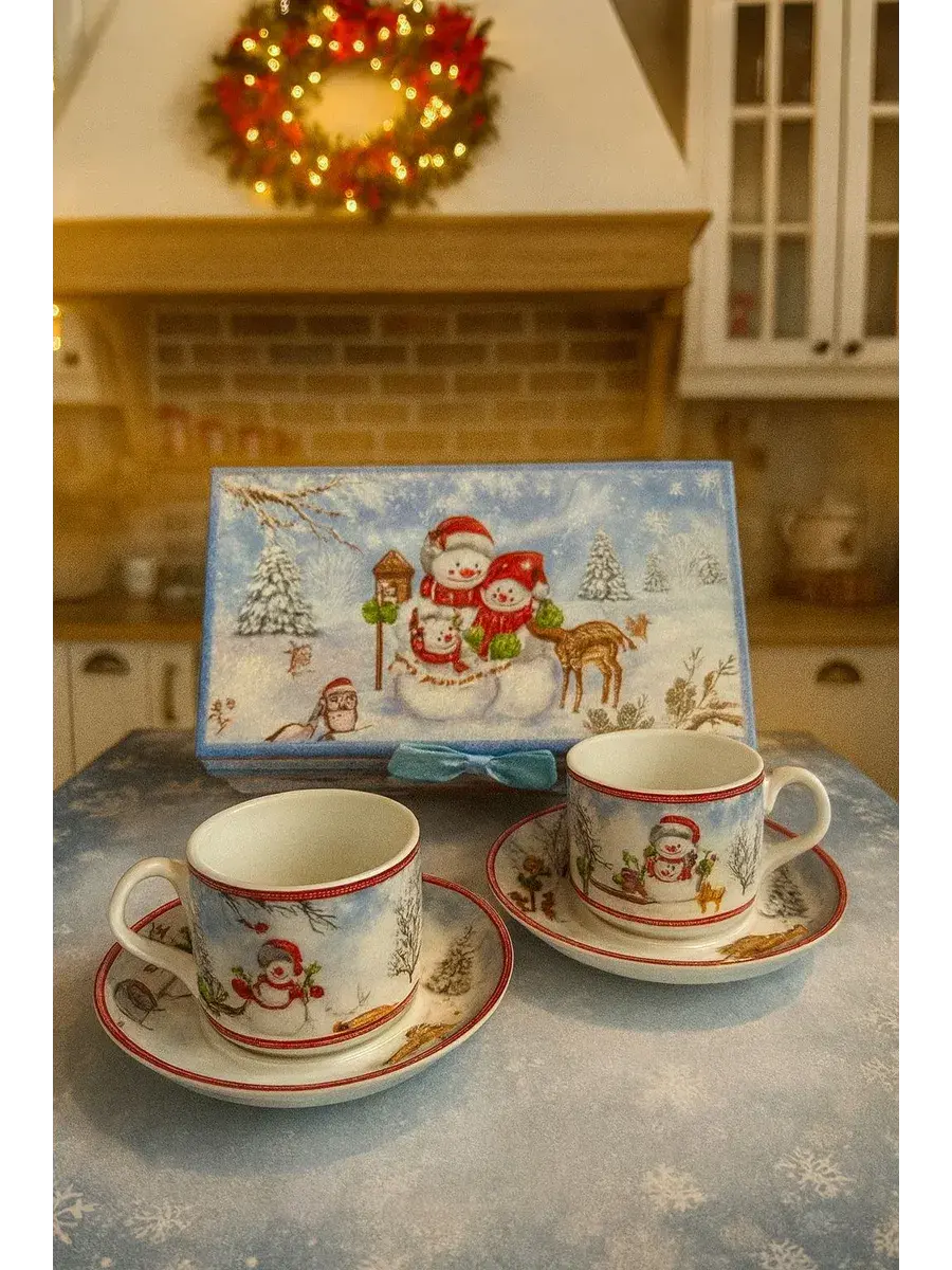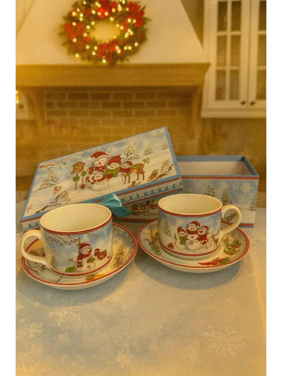 Набор из двух чашек и блюдец с ярким новогодним принтом снеговиков.