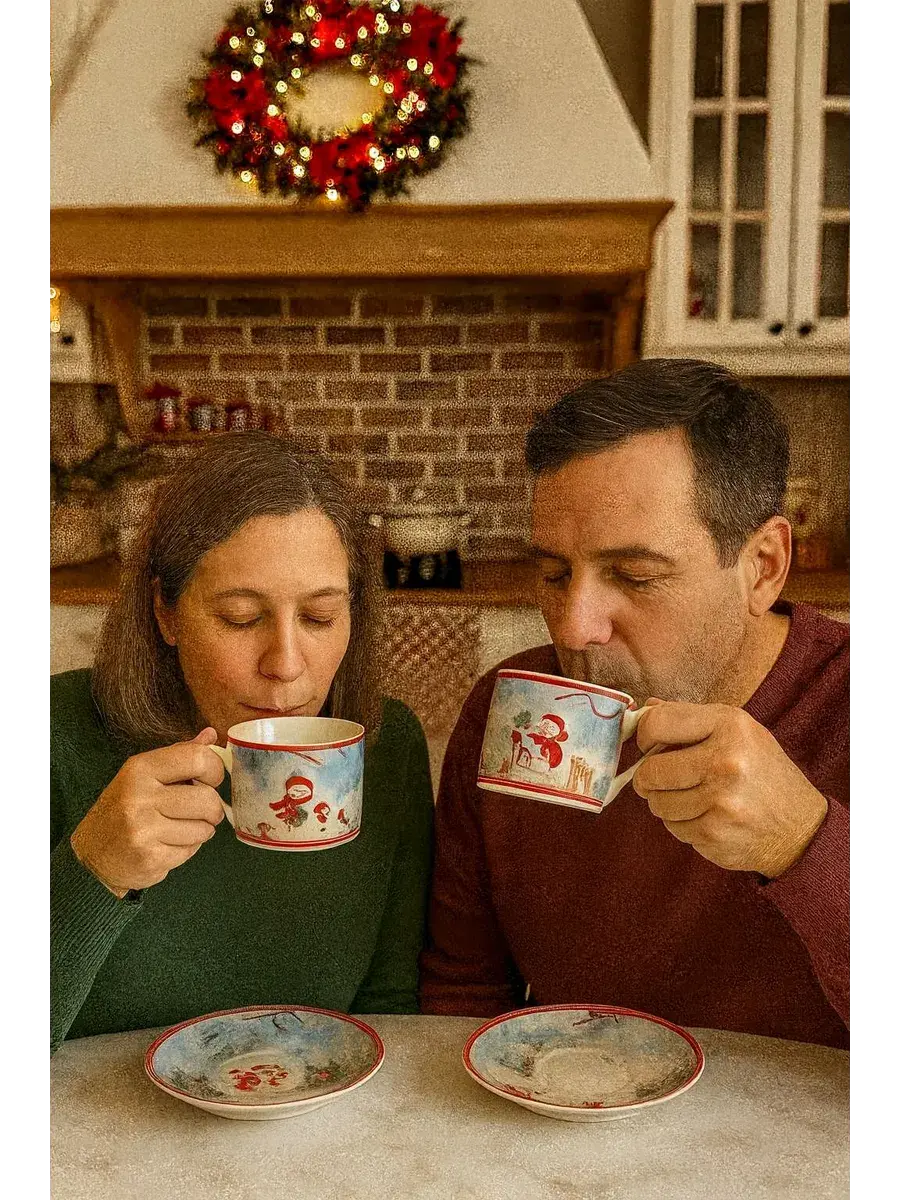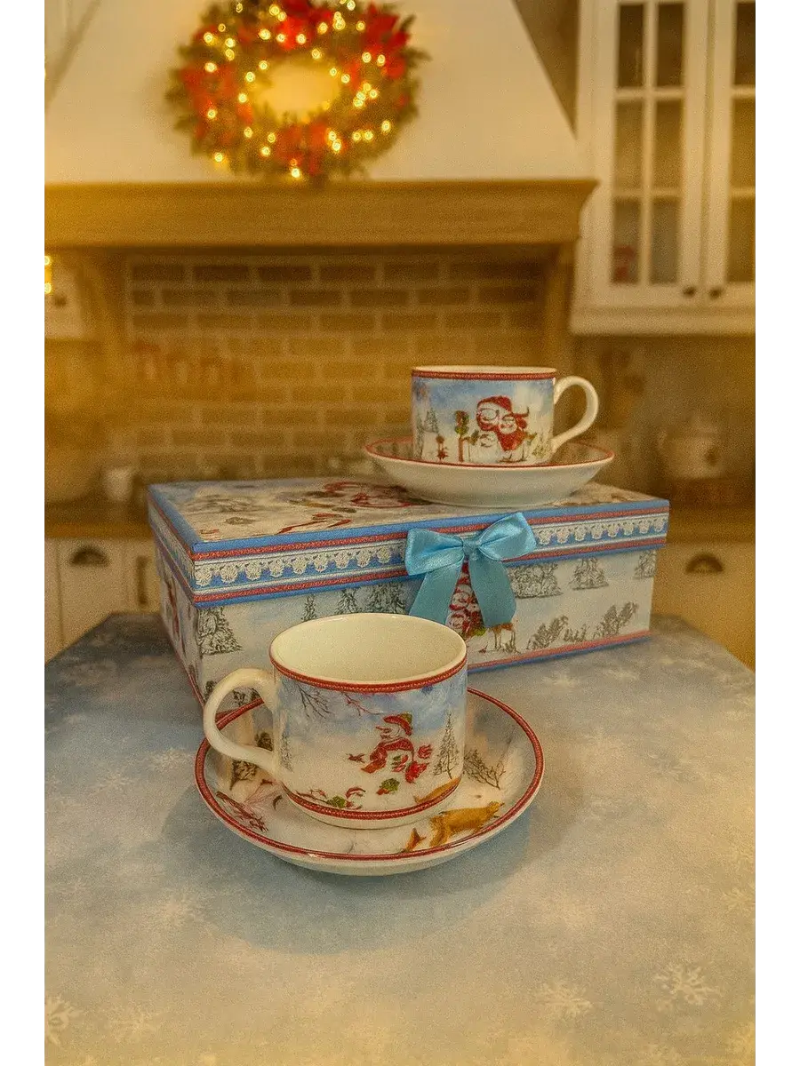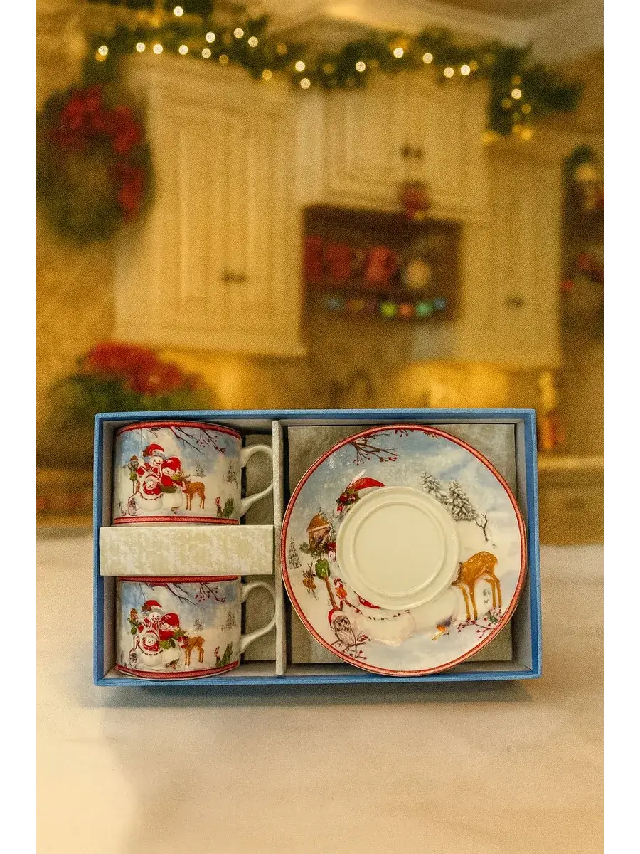 Набор из двух чашек и блюдец с ярким новогодним принтом снеговиков.