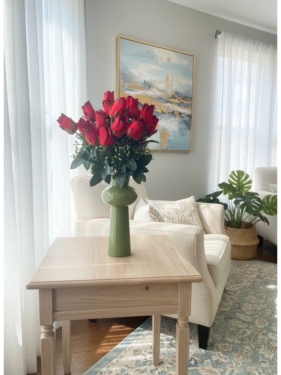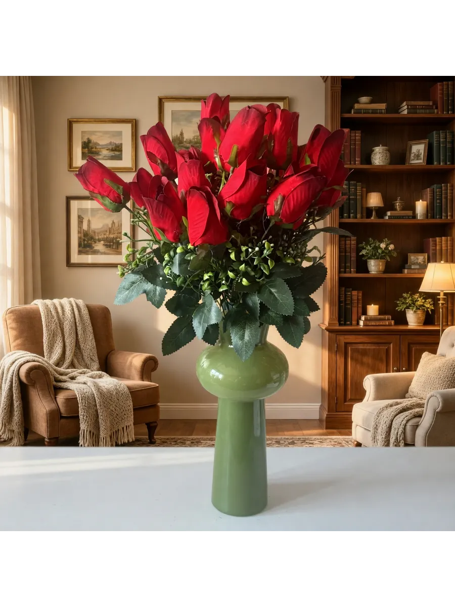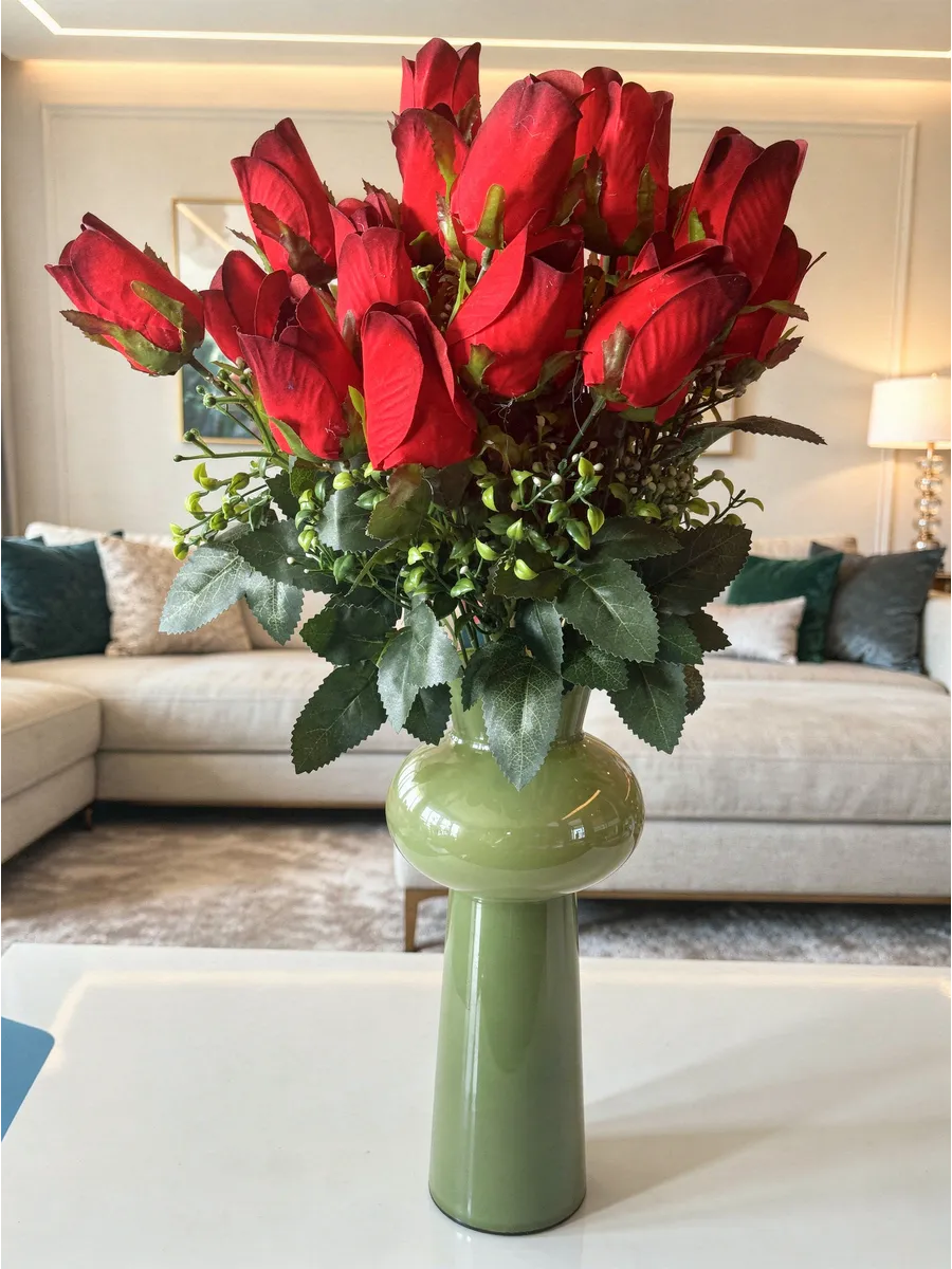 Этот роскошный букет из искусственных роз станет прекрасным украшением для любого праздника. Он состоит из одиннадцати реалистичных роз, собранных в пышный букет высотой 50 см и диаметром 40 см. Яркие красные, бархатные и красно-бордовые оттенки роз создают неповторимый и элегантный образ. Букет упакован в одну единицу и станет идеальным подарком на свадьбу, Пасху, 9 мая или любой другой торжественный случай.